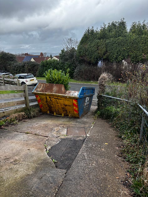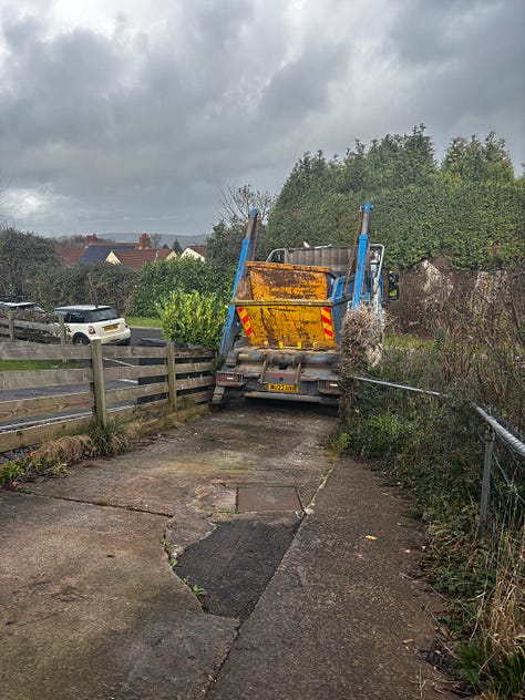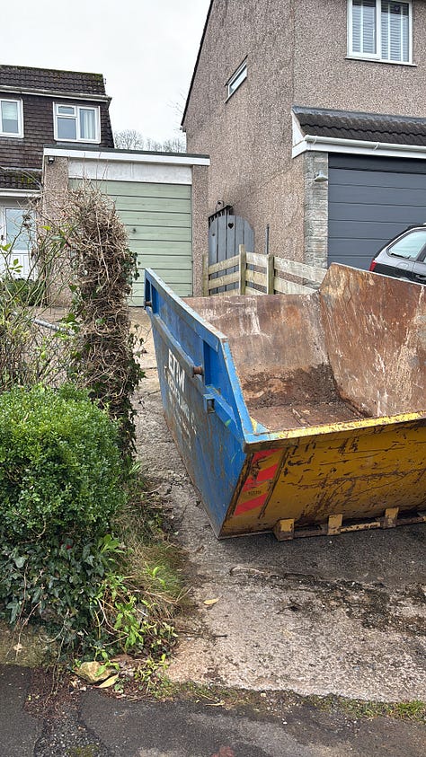 I was slightly worried about how they would managed ripping the kitchen out today- I needn’t have worried as a knock on my door at half 7 was another skip, promptly dropped on the road. Poor bloke wasn’t expecting me in my pjs, but then again, I wasn’t expecting him either!