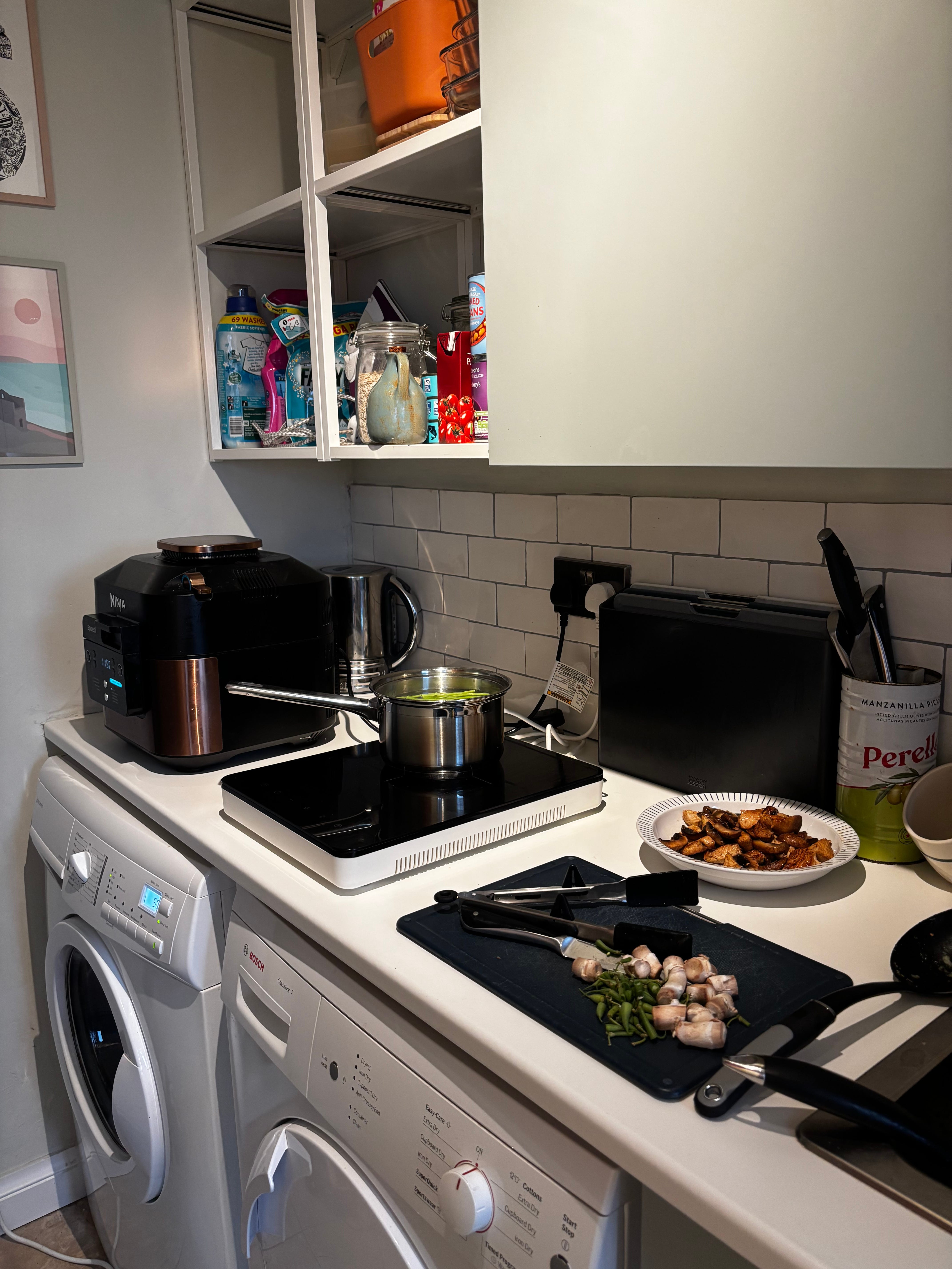 We managed to set up a little kitchen in our utility room, which I was delighted about! A borrowed fridge from my parents, the air fryer, a second hand induction hob from Vinted and it was a pretty good set up. I cooked in here over the weekend as the main fridge was gone and everything was in here for cooking.